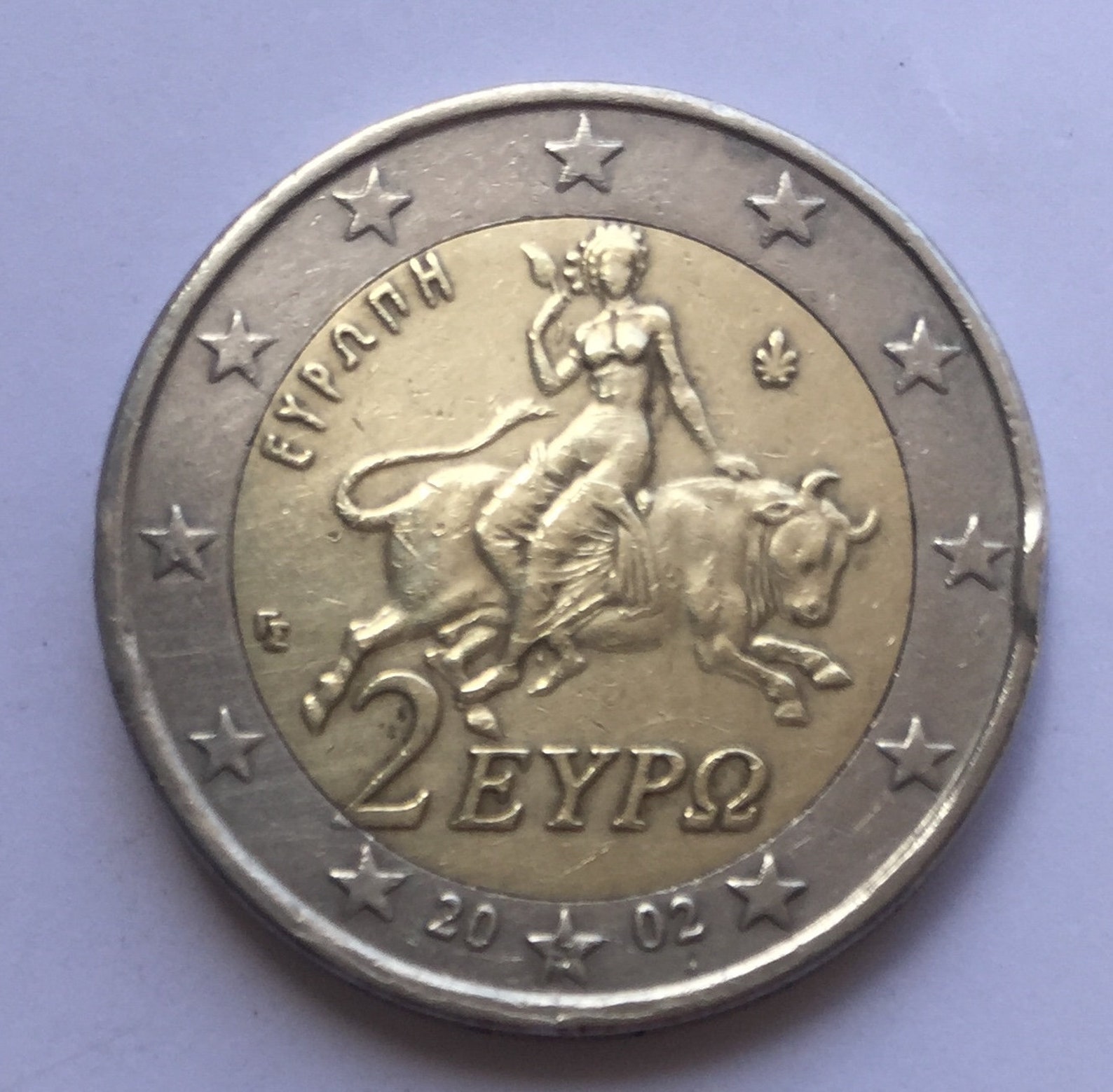 2002. Beschrijving: Normale 2 Euromunt van Griekenland met als motief De ontvoering van Europa. Randschrift: ΕΛΛΗΝΙΚΗ ΔΗΜΟΚΡΑΤΙΑ.
