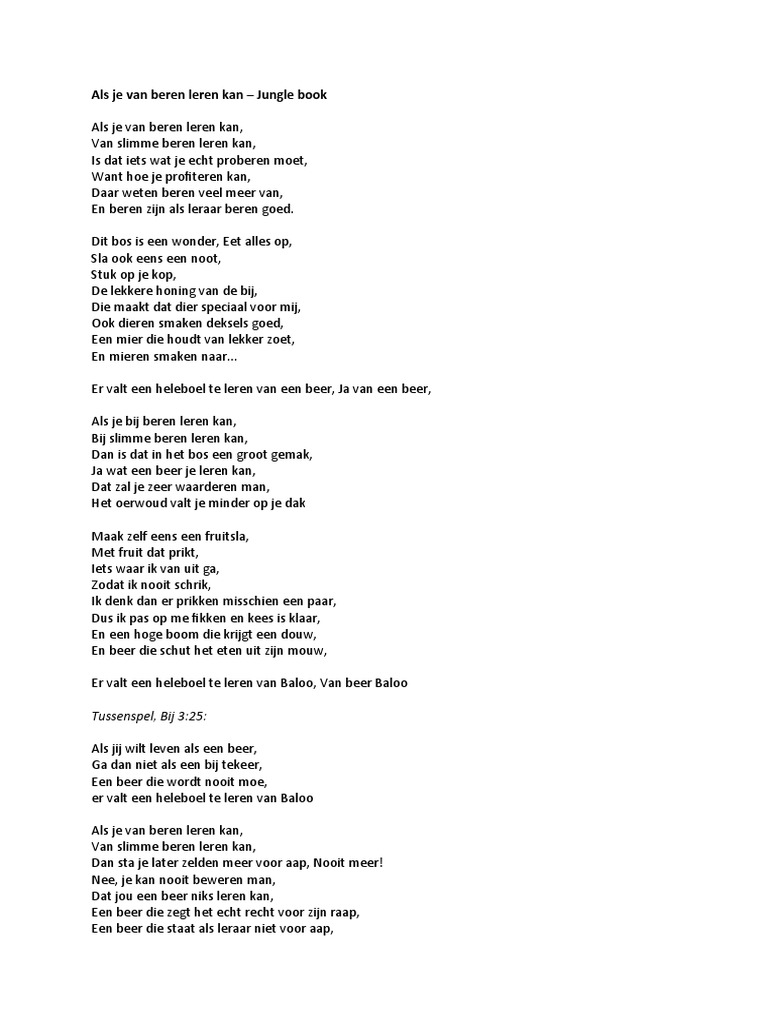 Tweet. Songtekst van The Jungle Book met Als je van beren leren kan kan je hier vinden op Songteksten.nl.
