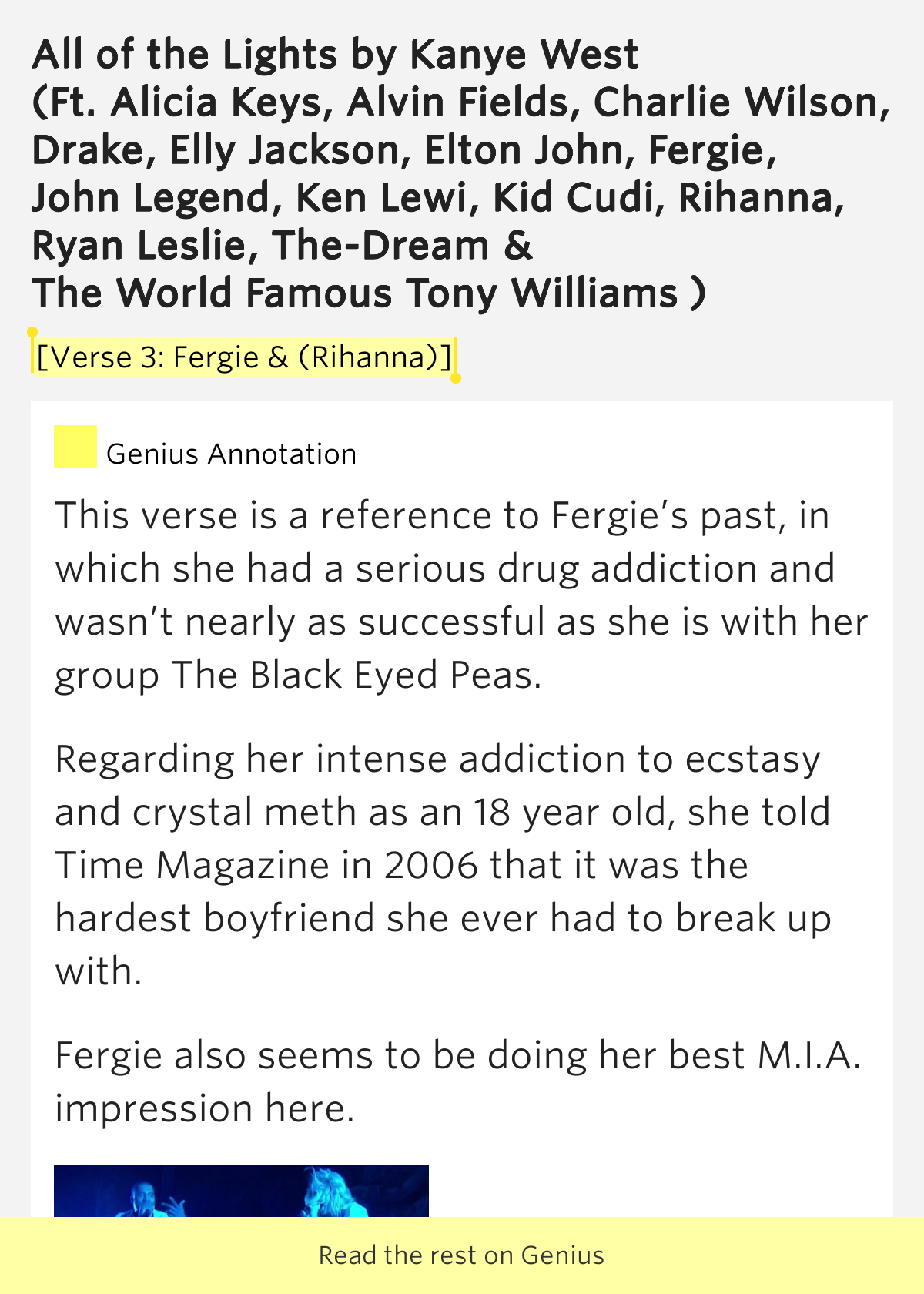 [Verse 3 Fergie & (Rihanna)] All of the Lights Lyrics Meaning